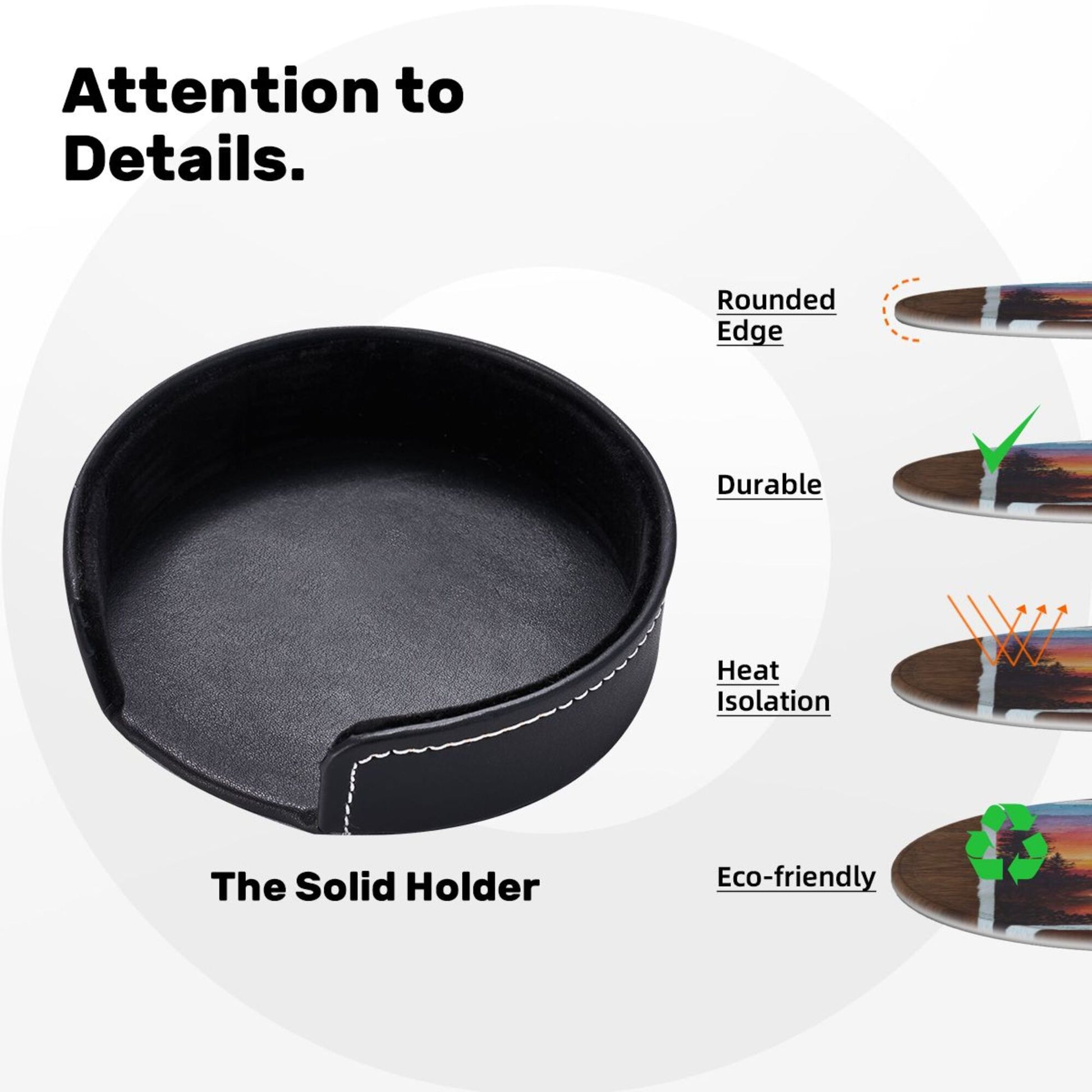 The storage box, crafted from black leather with neat stitching, matches the style of the coasters and facilitates storage. Storing 6 coasters in an orderly manner saves desktop space and keeps the coasters clean for easy access. Whether for personal use to decorate life or as a gift to convey artistic intentions, this coaster set, with its unique design and practical performance, can become a highlight of desktop decoration. It turns every cup - placing moment into a romantic experience of encountering natural beauty, infusing tranquility and goodness into life.