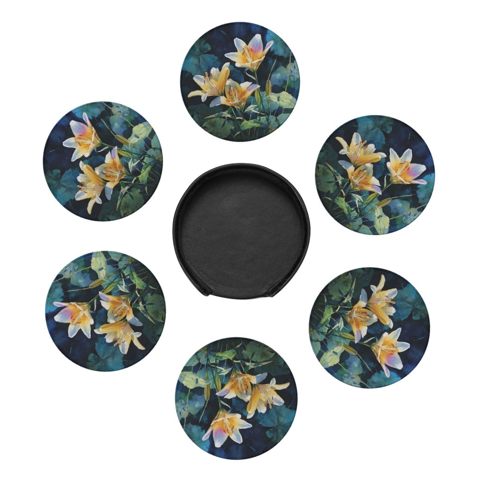 Watercolor Lily Round Leather Coaster Set (6 Pieces with Storage Box) - Floral Pattern Heat - Insulated Cup Pads