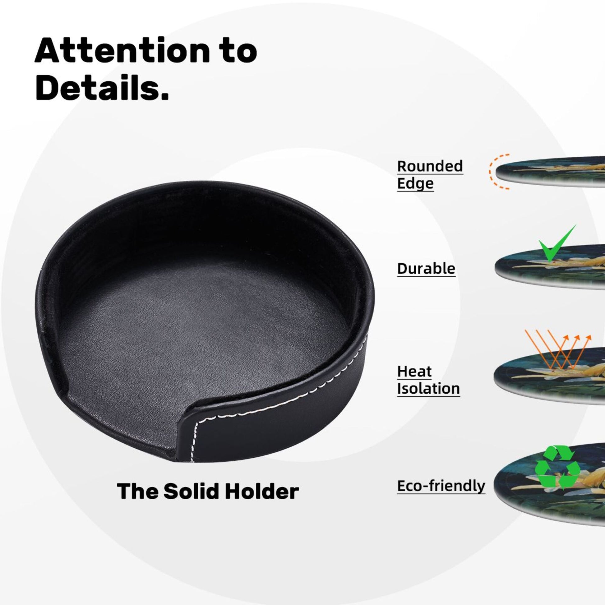 The storage box is made of black leather with neat stitching, echoing the style of the coasters, and is convenient for storage and organization. Storing 6 coasters in order not only saves desktop space but also keeps the coasters clean at all times. Whether placed on the coffee table in the living room, the dining table in the dining room, or the desktop in the office, this coaster set can, with its fresh floral pattern and practical performance, become a small item to enhance the space style, making every placement of tableware full of beauty and adding a touch of natural poetry to your life.